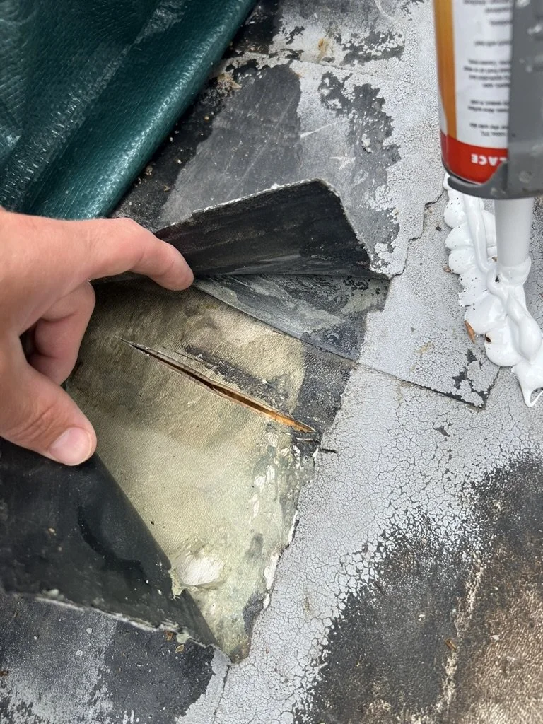 Worn or cracked caulking around vents, skylights, and edges leading to leaks.
